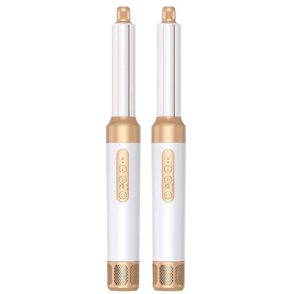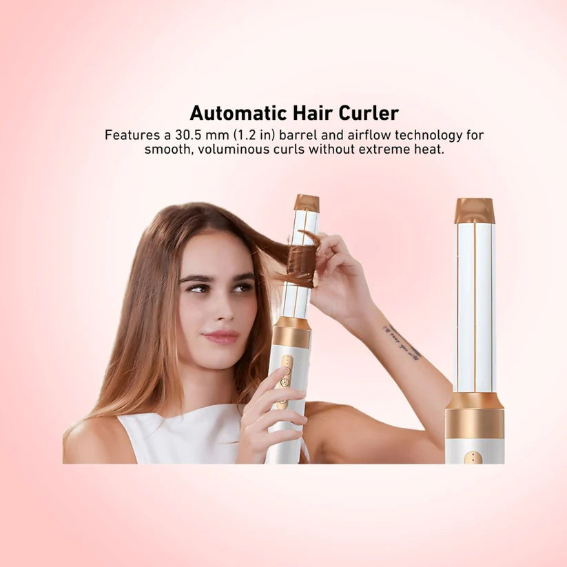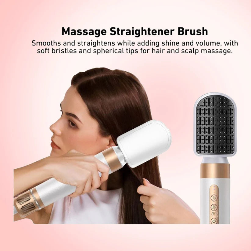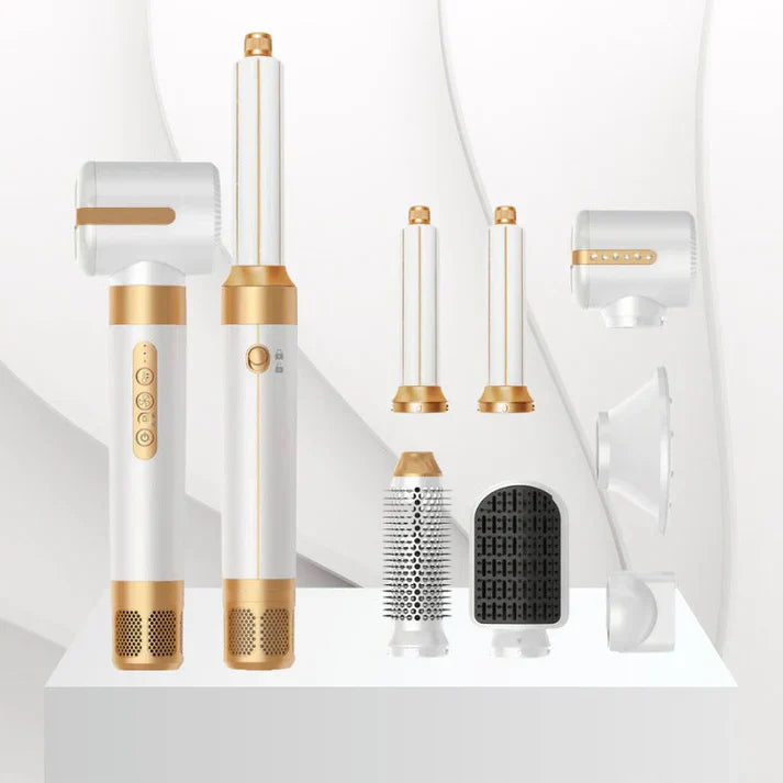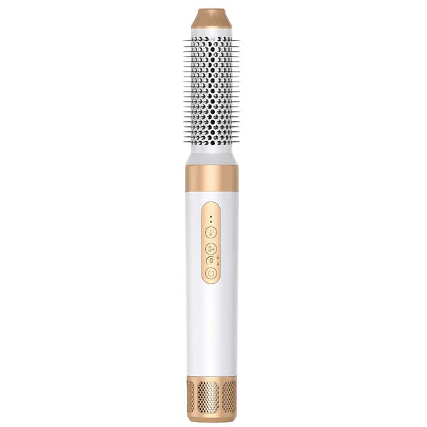 The 7-in-1 Airbrush Hair Dryer Pro includes 7 professional-grade attachments: hair dryer, round brush, two curling irons, straightening brush, diffuser, and styling nozzle.